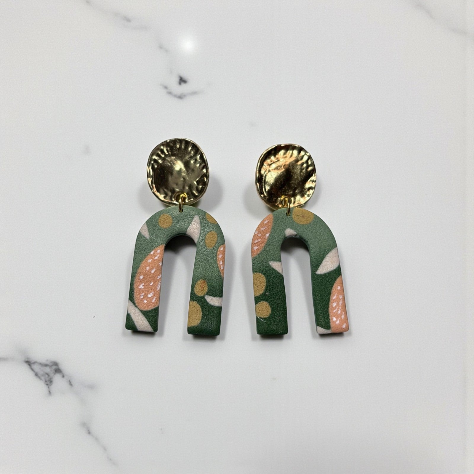 Pendientes hechos a mano que combina pieza metálica con arcilla polimérica.