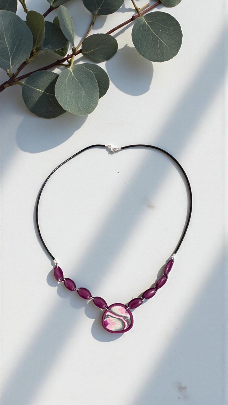 Collar artesanal hecho a mano con arcilla polimérica y acabado en resina UV brillante. Diseño único con colgante central geométrico en formas entrelazados en tono burdeos profundo, complementado con cuentas ovaladas del mismo color que crean un efecto elegante y contemporáneo.