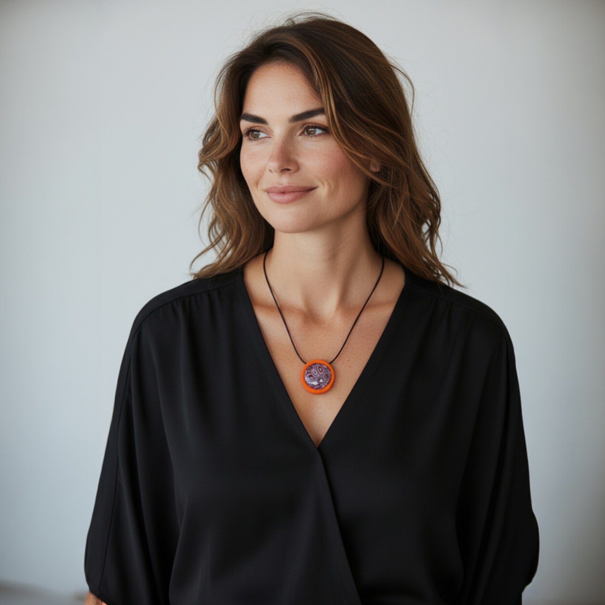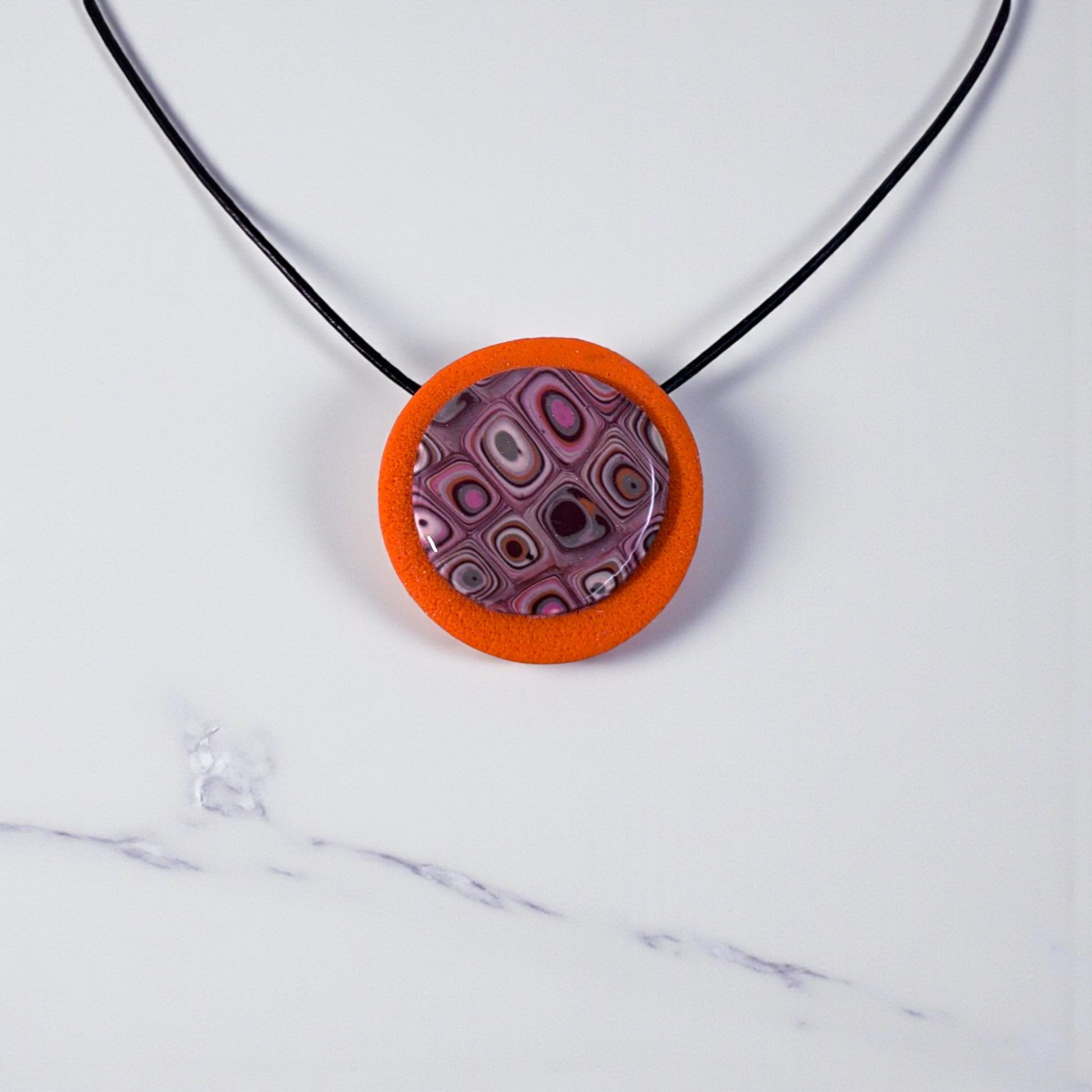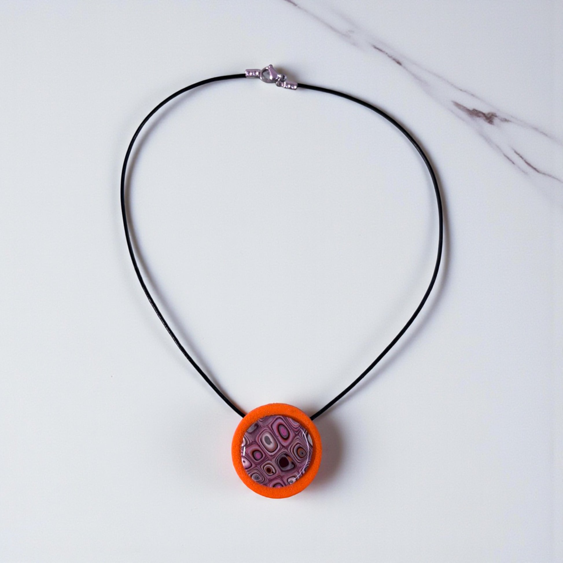 Collar artesanal hecho a mano con arcilla polimérica y acabado en resina UV brillante. Diseño único con colgante circular en vibrantes tonos naranja que enmarca un centro con mezcla de colores que incluyen el morado, verde, marrón, blanco y rosa que crean un efecto visual cautivador.